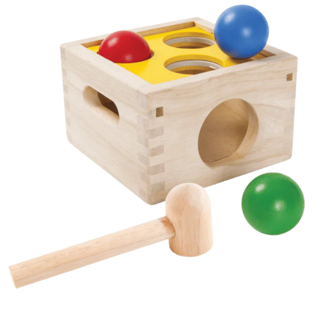 Punch & Drop from PlanToys includes three wooden balls that barely fit the three slots on top of the box, forcing children to hammer at them with the mallet until the balls drop through and are returned to play again. A great way to teach children about discipline and expressing their feelings without acting out against others.
